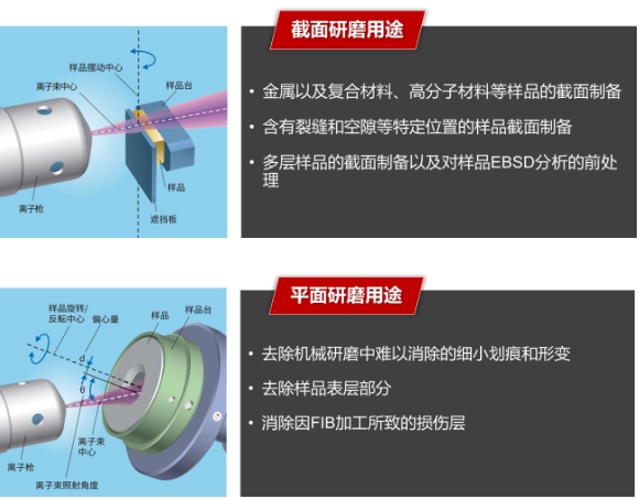平面研磨: 直径约为5mm范围内的均匀加工,应用领域广泛,最大可装载直径50mm×高度25mm的样品,可选择旋转和摆动(±60度,±90度的摆动)2种加工方法
