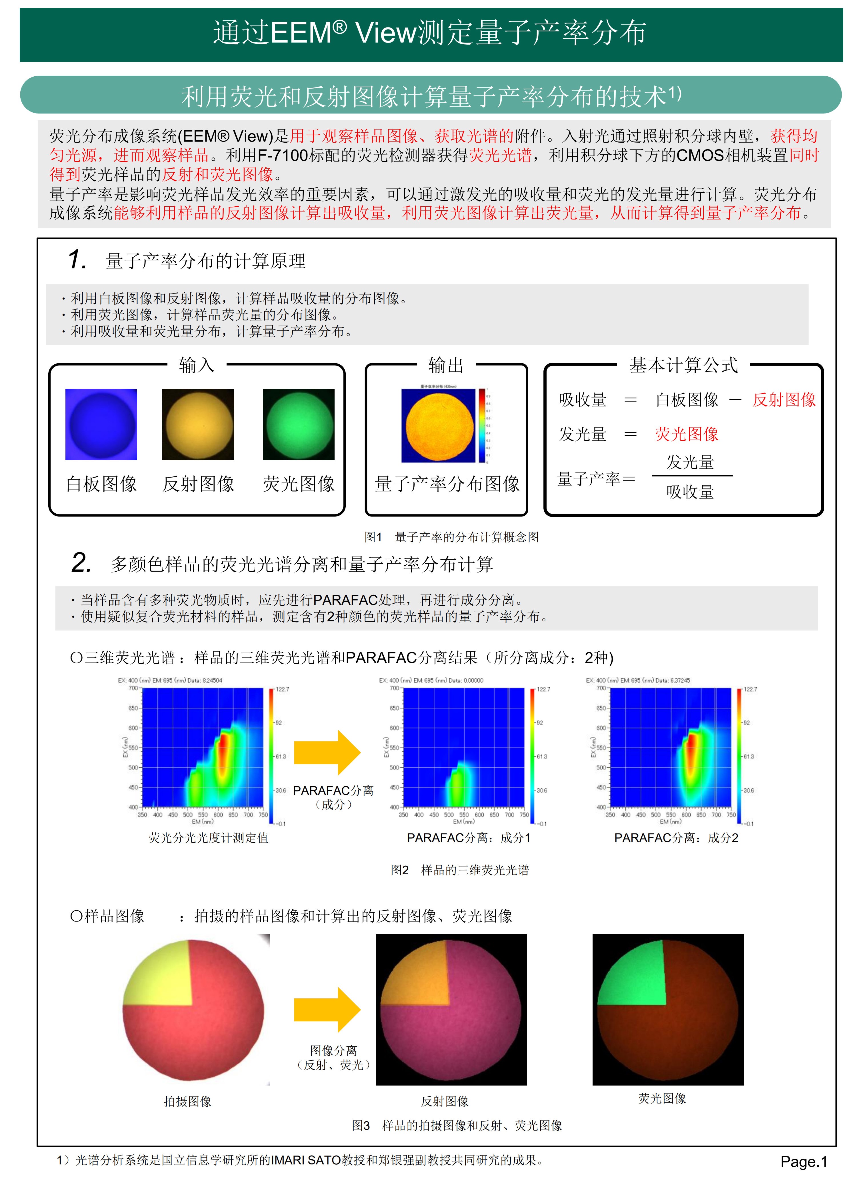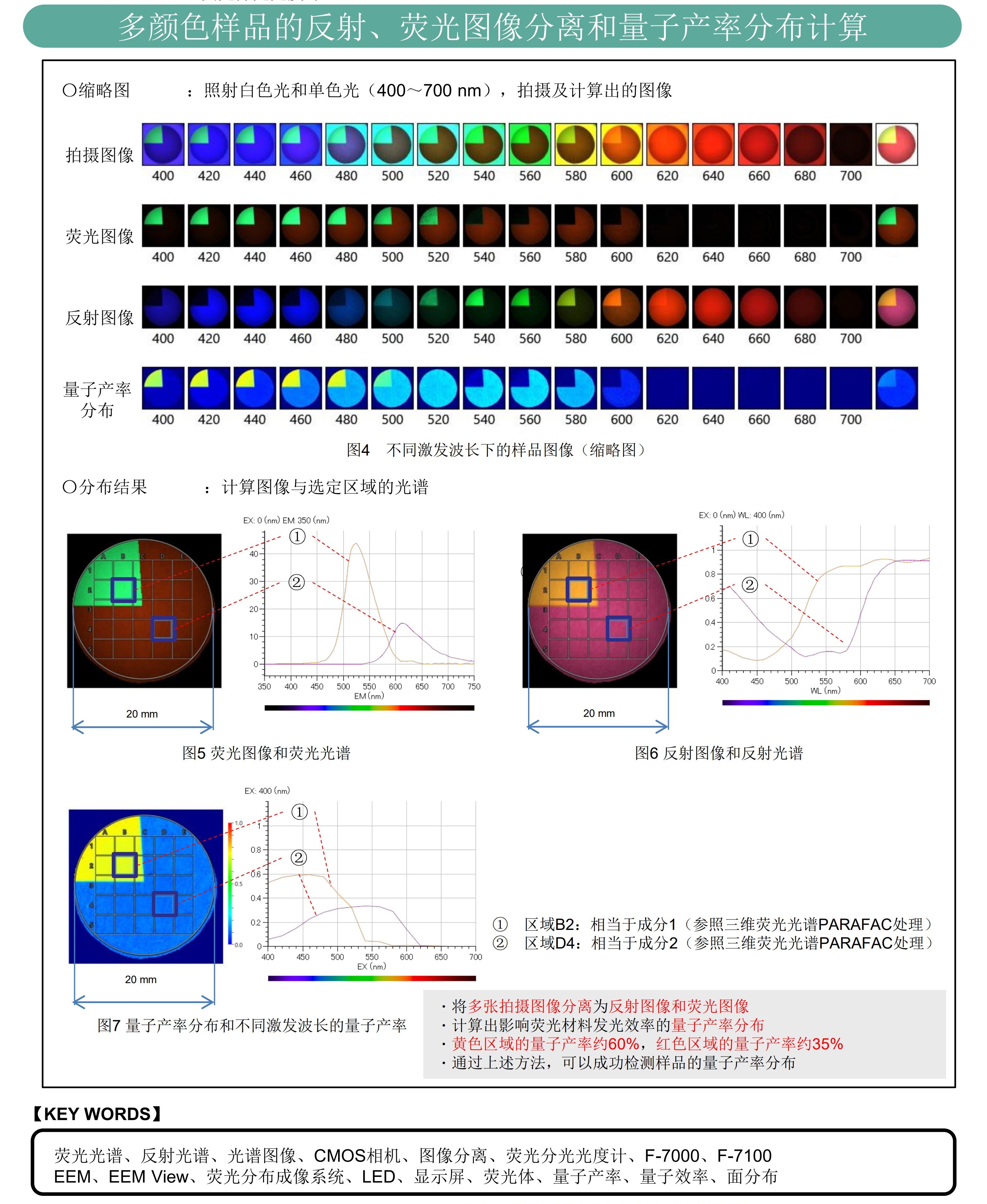 荧光分布成像系统不仅能够同时观察样品图像和光谱分布,还能够测定混合成分样品的量子产率分布。本文测定了具有两种颜色的样品发光效率,得出了两个区域的不同量子产率值。